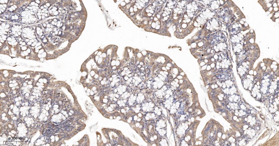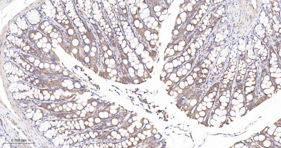 Paraformaldehyde-fixed, paraffin embedded Mouse Colon; Antigen retrieval by boiling in sodium citrate buffer (pH6.0) for 15 min; The section was incubated with IKK gamma Monoclonal Antibody, Unconjugated (bsm-54012R) at 1:200 overnight at 4°C, followed by conjugation to the bs-0295G-HRP and DAB (C-0010) staining.