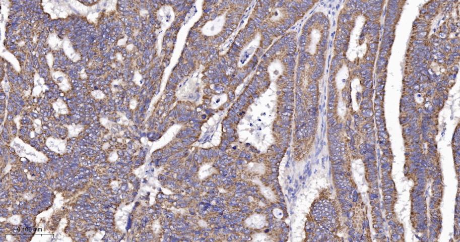 Paraformaldehyde-fixed, paraffin embedded Human Colon Cancer; Antigen retrieval by boiling in sodium citrate buffer (pH6.0) for 15 min; The section was incubated with IKK gamma Monoclonal Antibody, Unconjugated (bsm-54012R) at 1:200 overnight at 4°C, followed by conjugation to the bs-0295G-HRP and DAB (C-0010) staining.