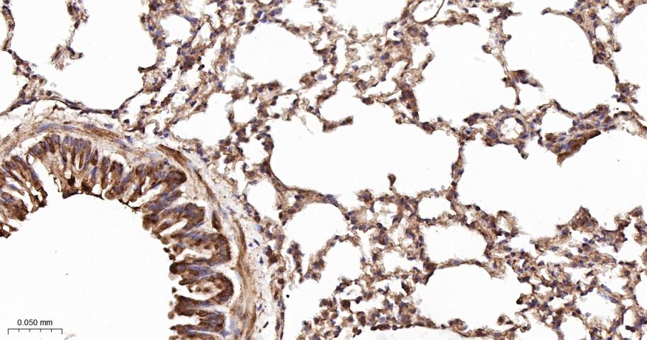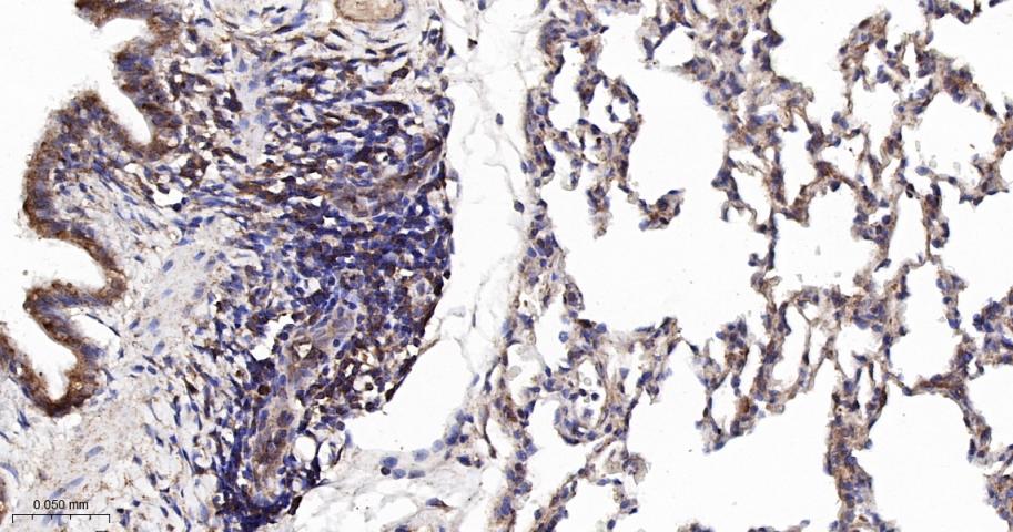 Paraformaldehyde-fixed, paraffin embedded Mouse Lung; Antigen retrieval by boiling in sodium citrate buffer (pH6.0) for 15 min; The section was incubated with IKK gamma Monoclonal Antibody, Unconjugated (bsm-54012R) at 1:200 overnight at 4°C, followed by conjugation to the bs-0295G-HRP and DAB (C-0010) staining.