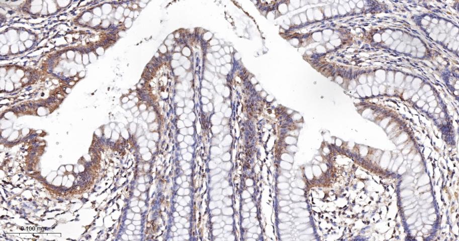 Paraformaldehyde-fixed, paraffin embedded Rat Colon; Antigen retrieval by boiling in sodium citrate buffer (pH6.0) for 15 min; The section was incubated with IKK gamma Monoclonal Antibody, Unconjugated (bsm-54012R) at 1:200 overnight at 4°C, followed by conjugation to the bs-0295G-HRP and DAB (C-0010) staining.