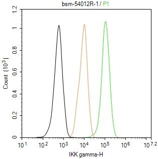 The Hela (H) cells were fixed with 4% PFA (10 min at r.t.) and then permeabilized with 90% ice-cold methanol for 20 min at -20℃,the cells then were incubated in 5%BSA to block non-specific protein-protein interactions (30 min at r.t.), followed by secondary antibody incubation for 40 min at room temperature. Primary Antibody (green):Rabbit Anti-IKK gamma antibody (bsm-54012R,1:100); Isotype Control (orange): Rabbit IgG (bs-0295P). Blank control (black): PBS. Acquisition of 20,000 events was performed.
