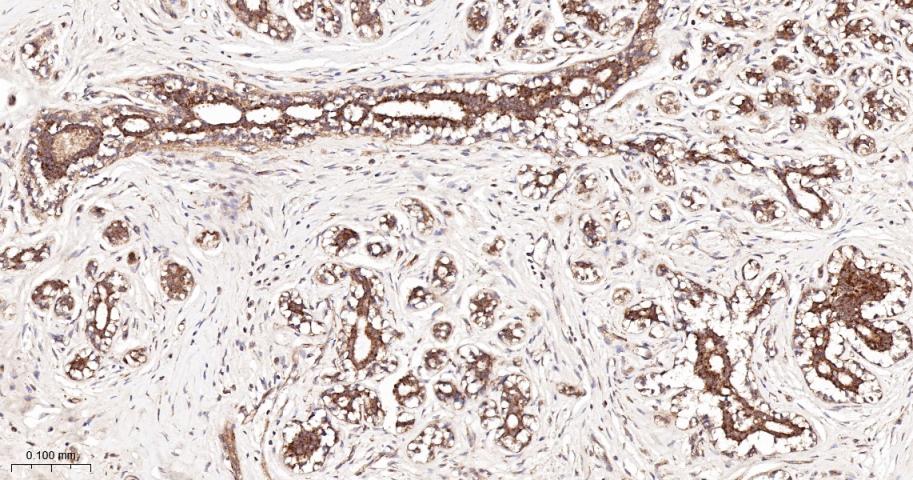 Paraformaldehyde-fixed, paraffin embedded Human Breast Cancer; Antigen retrieval by boiling in sodium citrate buffer (pH6.0) for 15 min; The section was incubated with IKK gamma Monoclonal Antibody, Unconjugated (bsm-54012R) at 1:200 overnight at 4°C, followed by conjugation to the bs-0295G-HRP and DAB (C-0010) staining.