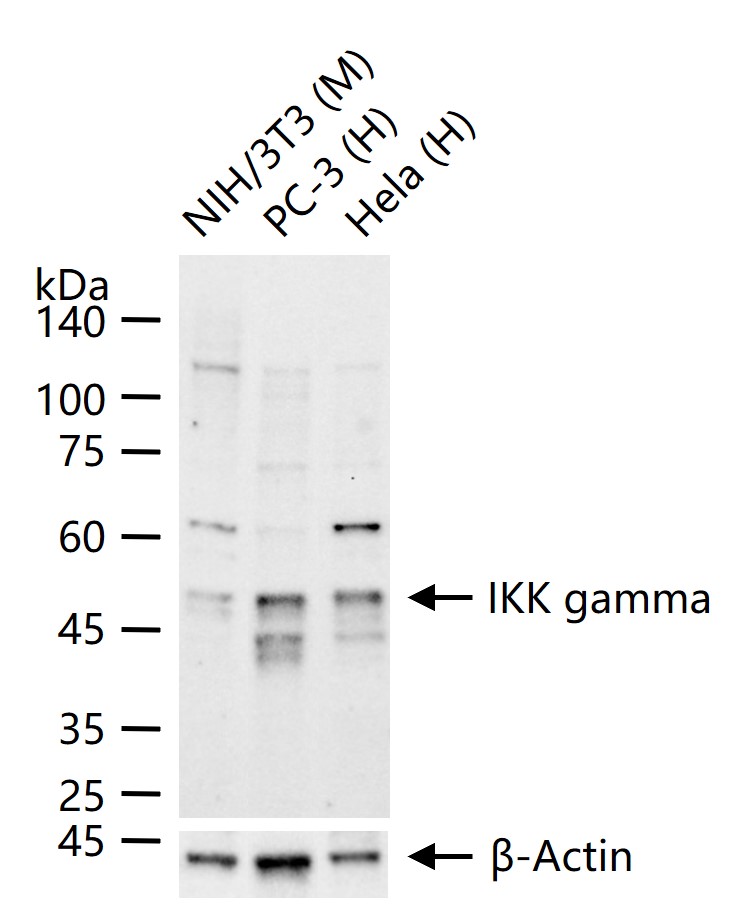 25 ug total protein per lane of various lysates (see on figure) probed with IKK gamma monoclonal antibody, unconjugated (bsm-54012R) at 1:1000 dilution and 4°C overnight incubation. Followed by conjugated secondary antibody incubation at r.t. for 60 min.