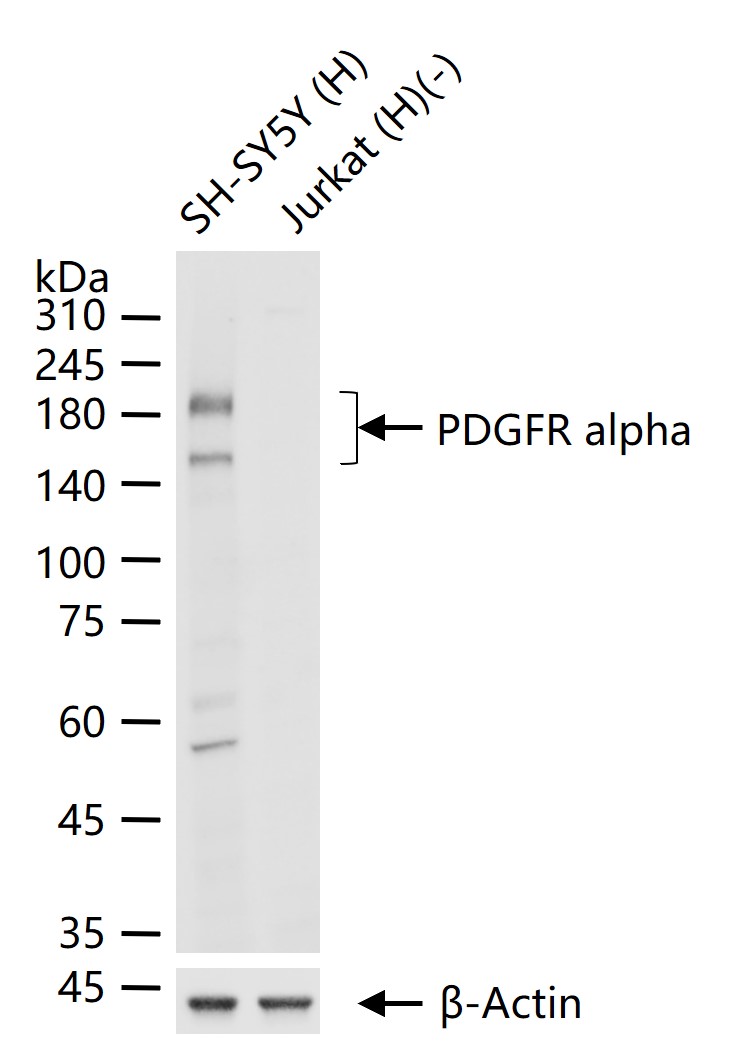 25 ug total protein per lane of various lysates (see on figure) probed with PDGFR alpha monoclonal antibody, unconjugated (bsm-52829R) at 1:1000 dilution and 4°C overnight incubation. Followed by conjugated secondary antibody incubation at r.t. for 60 min.