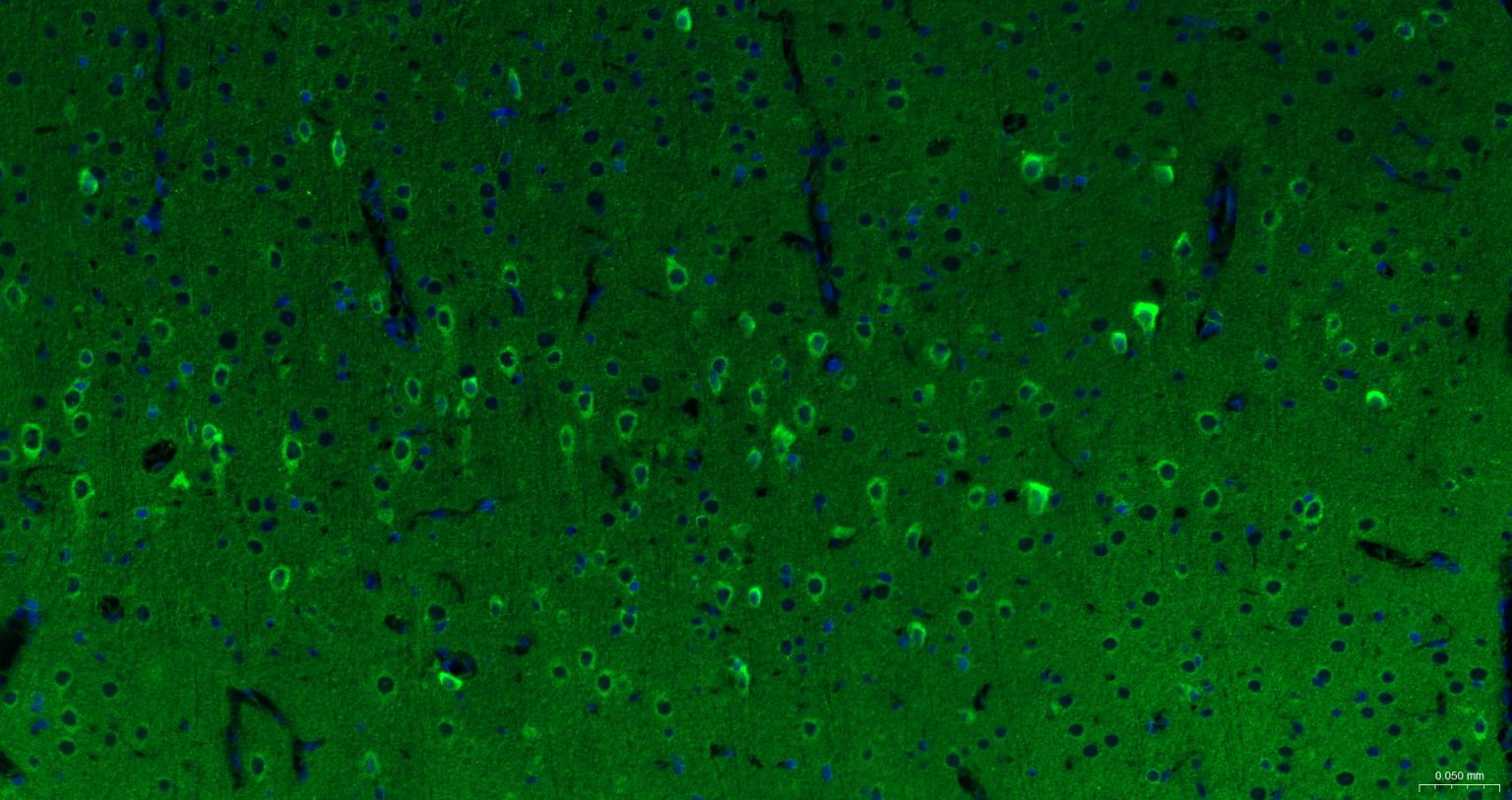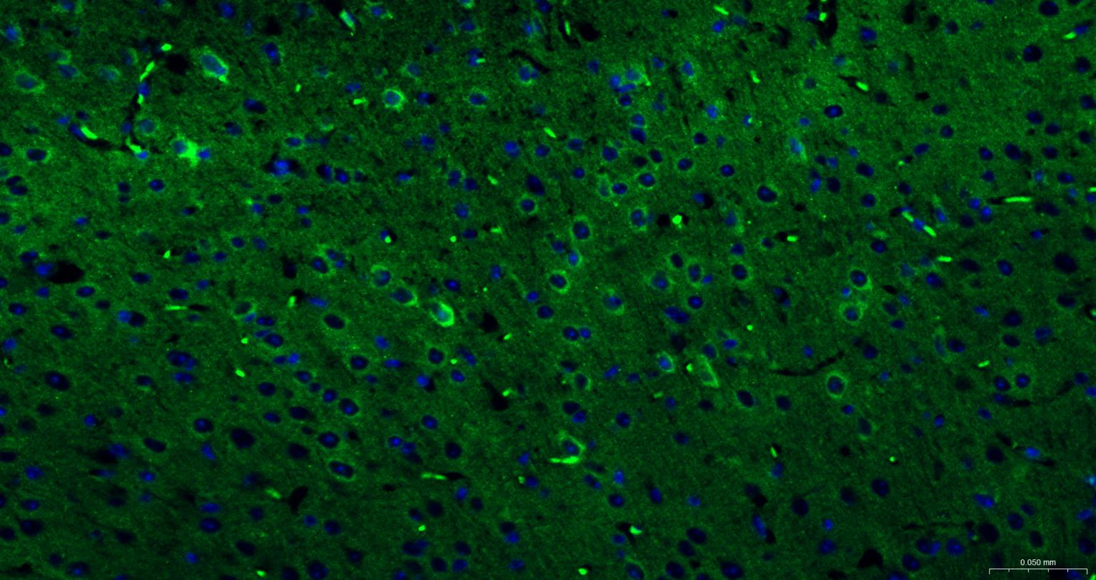 Paraformaldehyde-fixed, paraffin embedded Rat Cerebrum; Antigen retrieval by boiling in sodium citrate buffer (pH6.0) for 15 min; The section was incubated with DNM1L Polyclonal Antibody, Unconjugated (bs-34001R) at 1:200 overnight at 4°C. Followed by conjugated Goat Anti-Rabbit IgG antibody (Green, bs-0295G-BF488), DAPI (blue, C02-04002) was used to stain the cell nuclei.