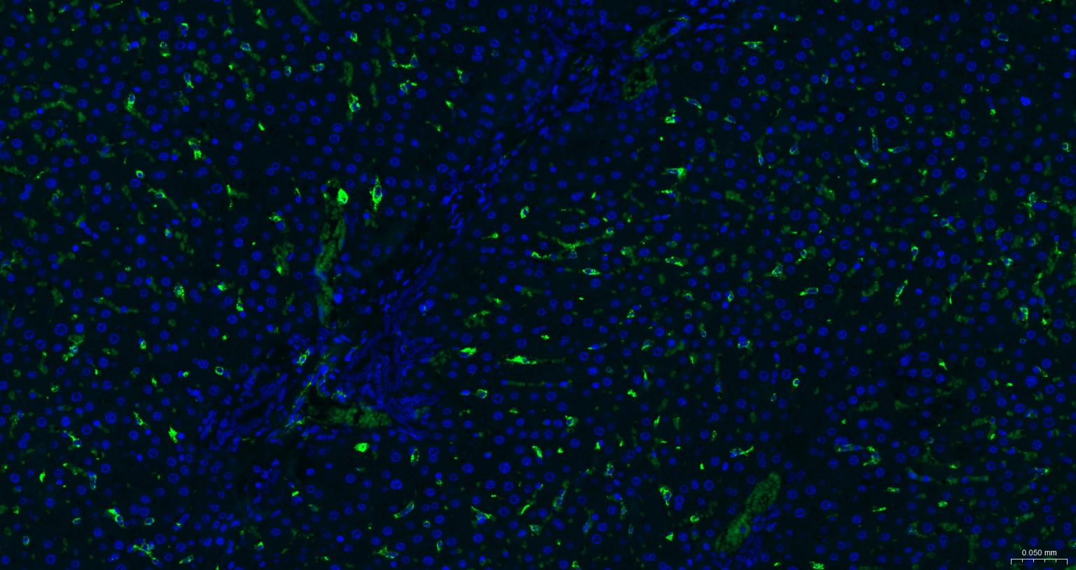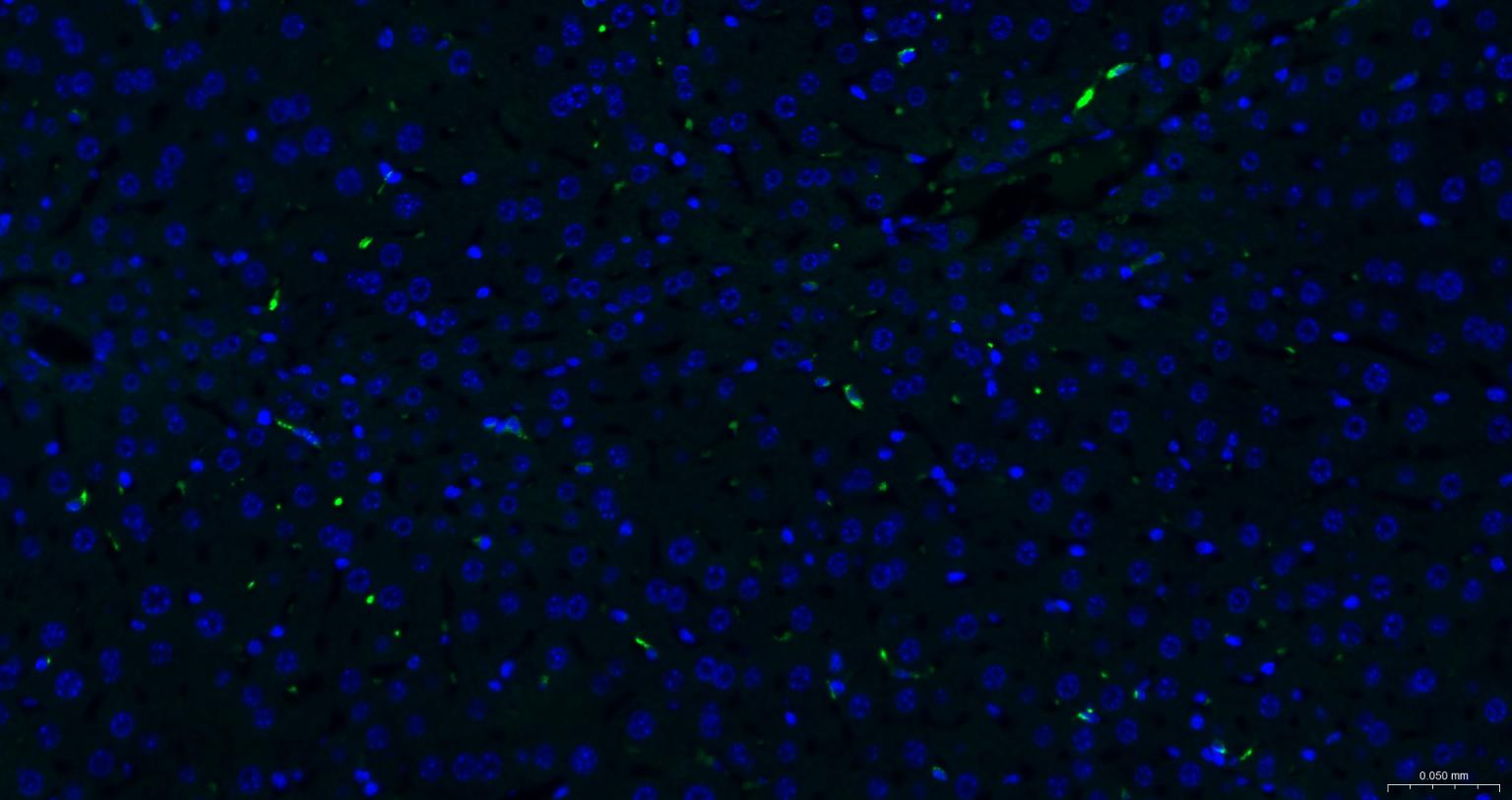 Paraformaldehyde-fixed, paraffin embedded Mouse Liver; Antigen retrieval by boiling in sodium citrate buffer (pH6.0) for 15 min; The section was incubated with CD163 Monoclonal Antibody, Unconjugated (bsm-54015R) at 1:200 overnight at 4°C. Followed by conjugated Goat Anti-Mouse IgG antibody (Green, bs-0295G-BF488), DAPI (blue, C02-04002) was used to stain the cell nuclei.