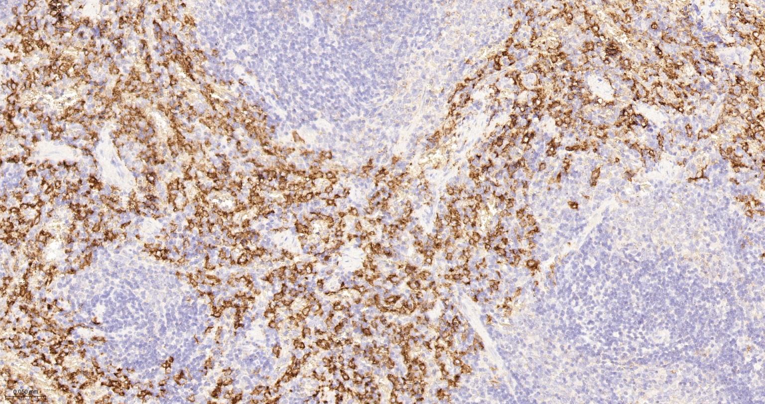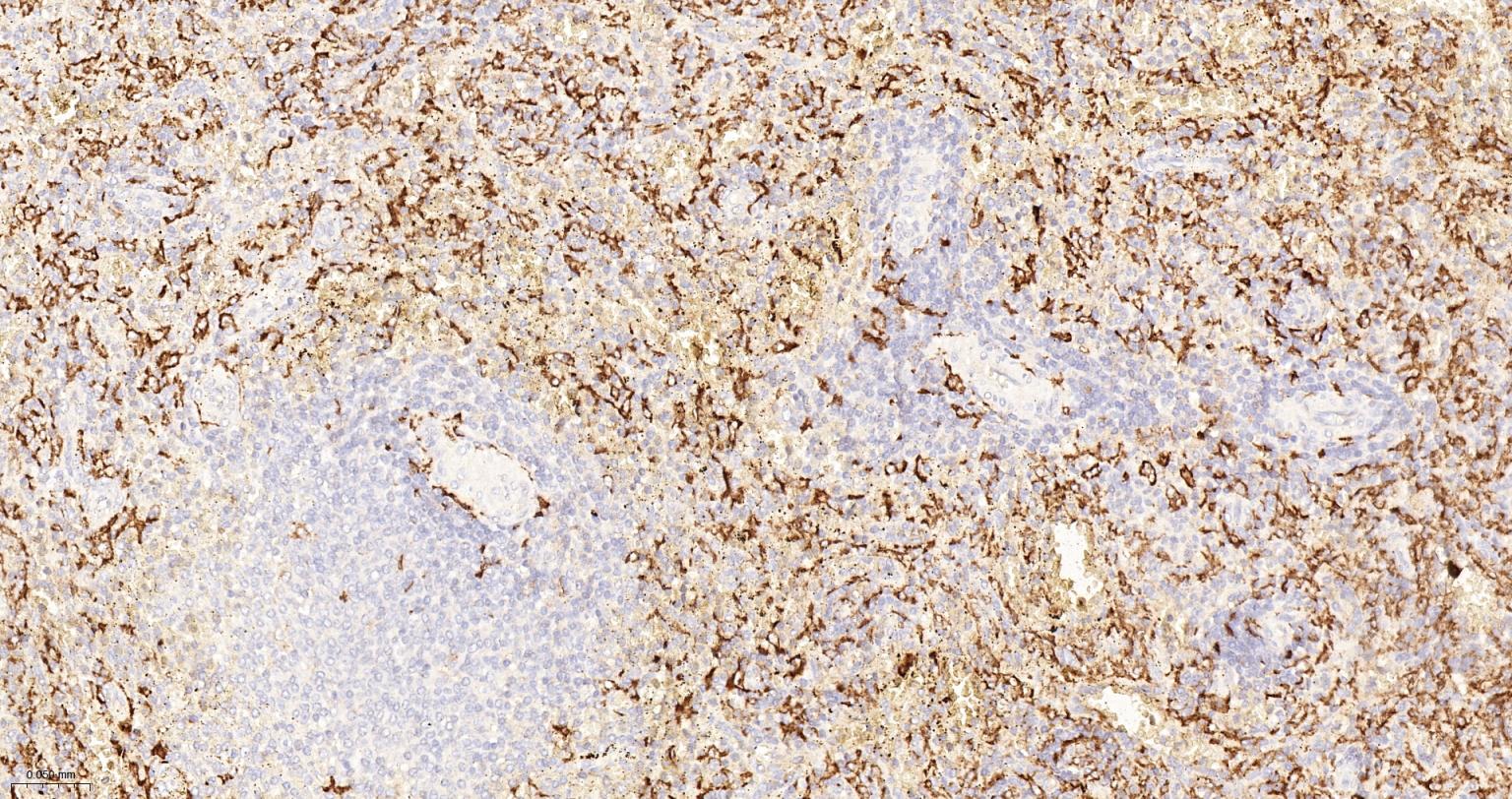Paraformaldehyde-fixed, paraffin embedded Human Spleen; Antigen retrieval by boiling in sodium citrate buffer (pH6.0) for 15 min; Antibody incubation with CD163 Monoclonal Antibody, Unconjugated(bsm-54015R) at 1:200 overnight at 4°C, followed by conjugation to the bs-0295G-HRP and DAB (C-0010) staining.