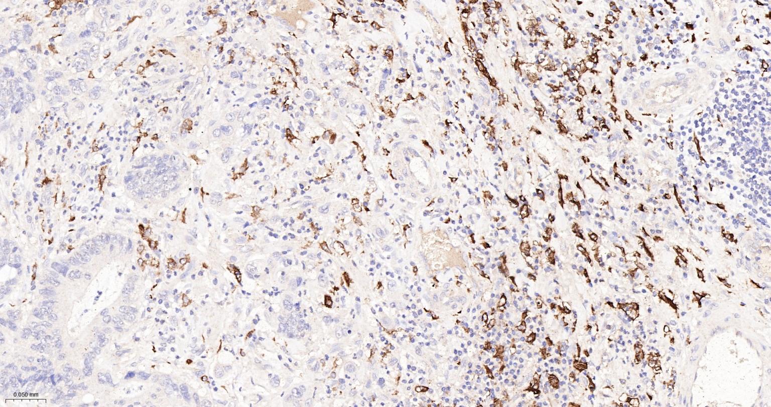 Paraformaldehyde-fixed, paraffin embedded Human Colon Cancer; Antigen retrieval by boiling in sodium citrate buffer (pH6.0) for 15 min; Antibody incubation with CD163 Monoclonal Antibody, Unconjugated(bsm-54015R) at 1:200 overnight at 4°C, followed by conjugation to the bs-0295G-HRP and DAB (C-0010) staining.