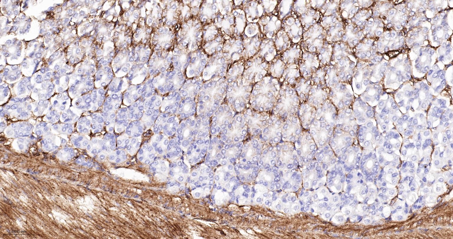 Paraformaldehyde-fixed, paraffin embedded Mouse Stomach; Antigen retrieval by boiling in sodium citrate buffer (pH6.0) for 15 min; Antibody incubation with Vinculin Monoclonal Antibody, Unconjugated(bsm-54148R) at 1:1000 overnight at 4°C, followed by conjugation to the bs-0295G-HRP and DAB (C-0010) staining.