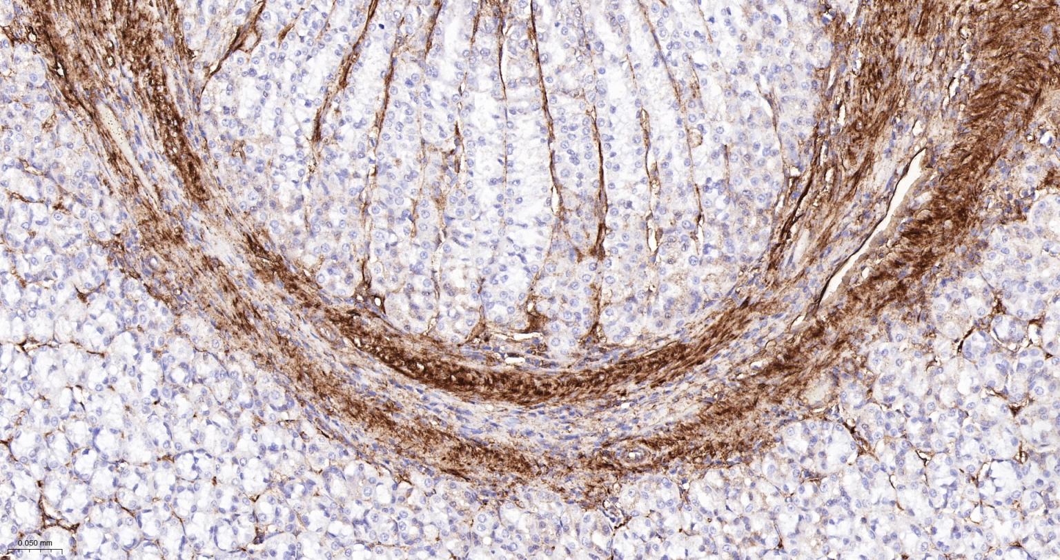 Paraformaldehyde-fixed, paraffin embedded Rat Stomach; Antigen retrieval by boiling in sodium citrate buffer (pH6.0) for 15 min; Antibody incubation with Vinculin Monoclonal Antibody, Unconjugated(bsm-54148R) at 1:1000 overnight at 4°C, followed by conjugation to the bs-0295G-HRP and DAB (C-0010) staining.