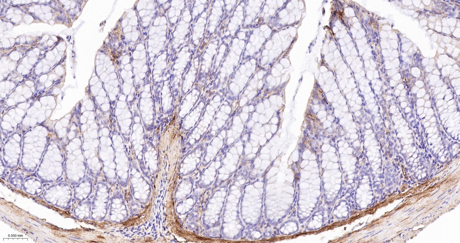 Paraformaldehyde-fixed, paraffin embedded Mouse Colon; Antigen retrieval by boiling in sodium citrate buffer (pH6.0) for 15 min; Antibody incubation with Vinculin Monoclonal Antibody, Unconjugated(bsm-54148R) at 1:1000 overnight at 4°C, followed by conjugation to the bs-0295G-HRP and DAB (C-0010) staining.