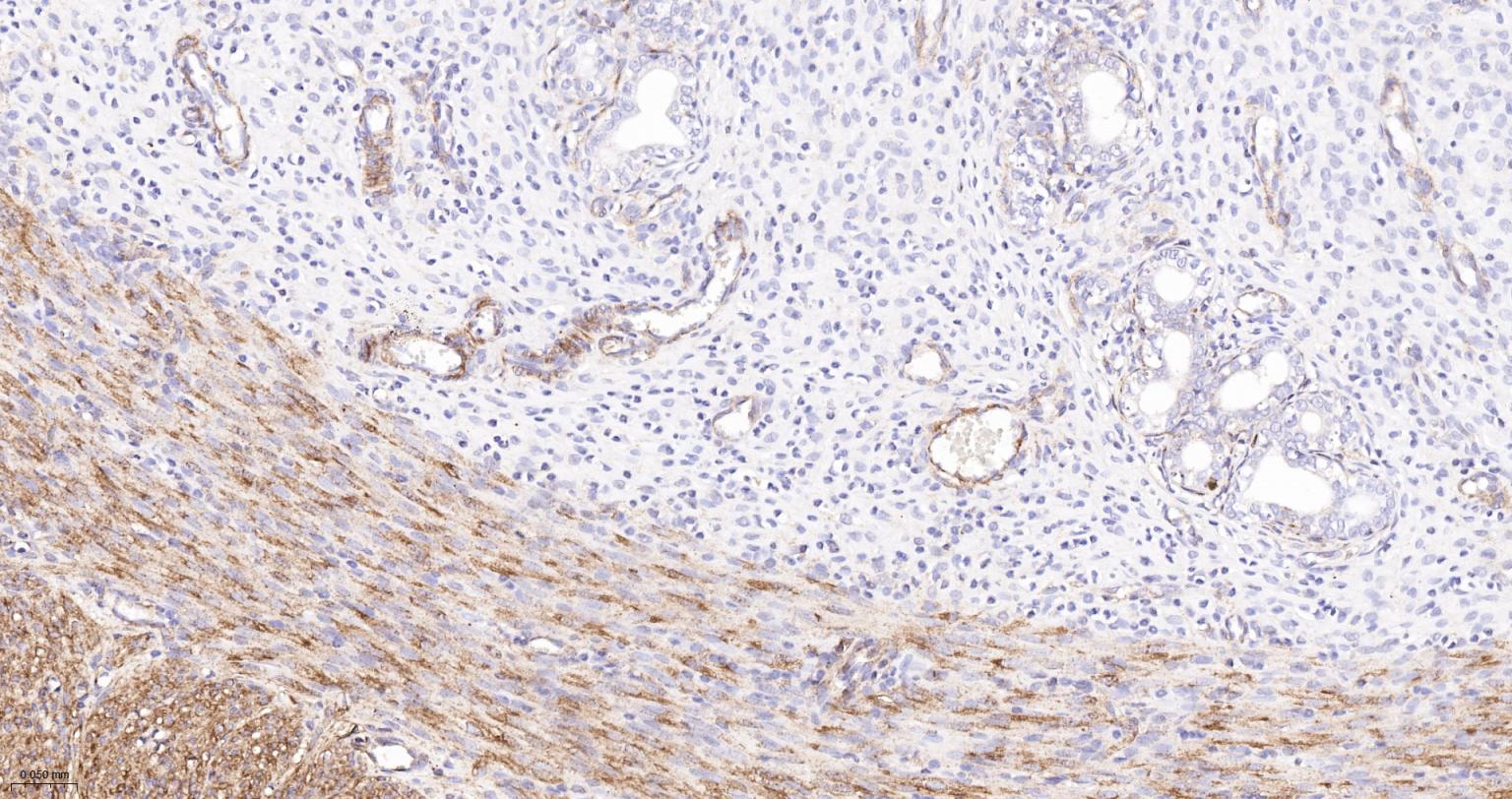 Paraformaldehyde-fixed, paraffin embedded Human Uterus; Antigen retrieval by boiling in sodium citrate buffer (pH6.0) for 15 min; The section was incubated with Vinculin Monoclonal Antibody, Unconjugated (bsm-54148R) at 1:1000 overnight at 4°C, followed by conjugation to the bs-0295G-HRP and DAB (C-0010) staining.