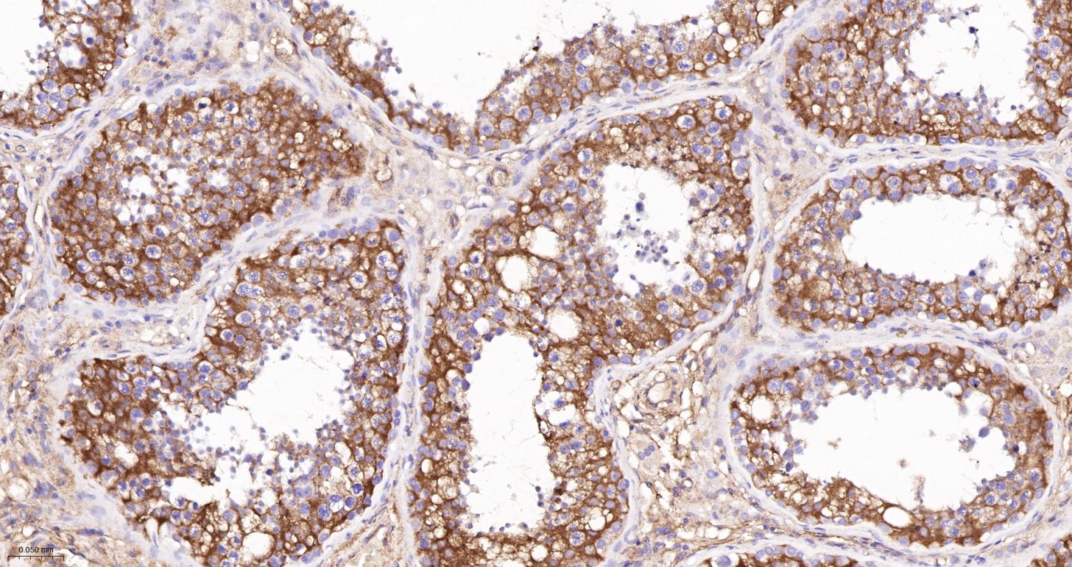 Paraformaldehyde-fixed, paraffin embedded Human Testicles; Antigen retrieval by boiling in sodium citrate buffer (pH6.0) for 15 min; The section was incubated with Vinculin Monoclonal Antibody, Unconjugated (bsm-54148R) at 1:1000 overnight at 4°C, followed by conjugation to the bs-0295G-HRP and DAB (C-0010) staining.