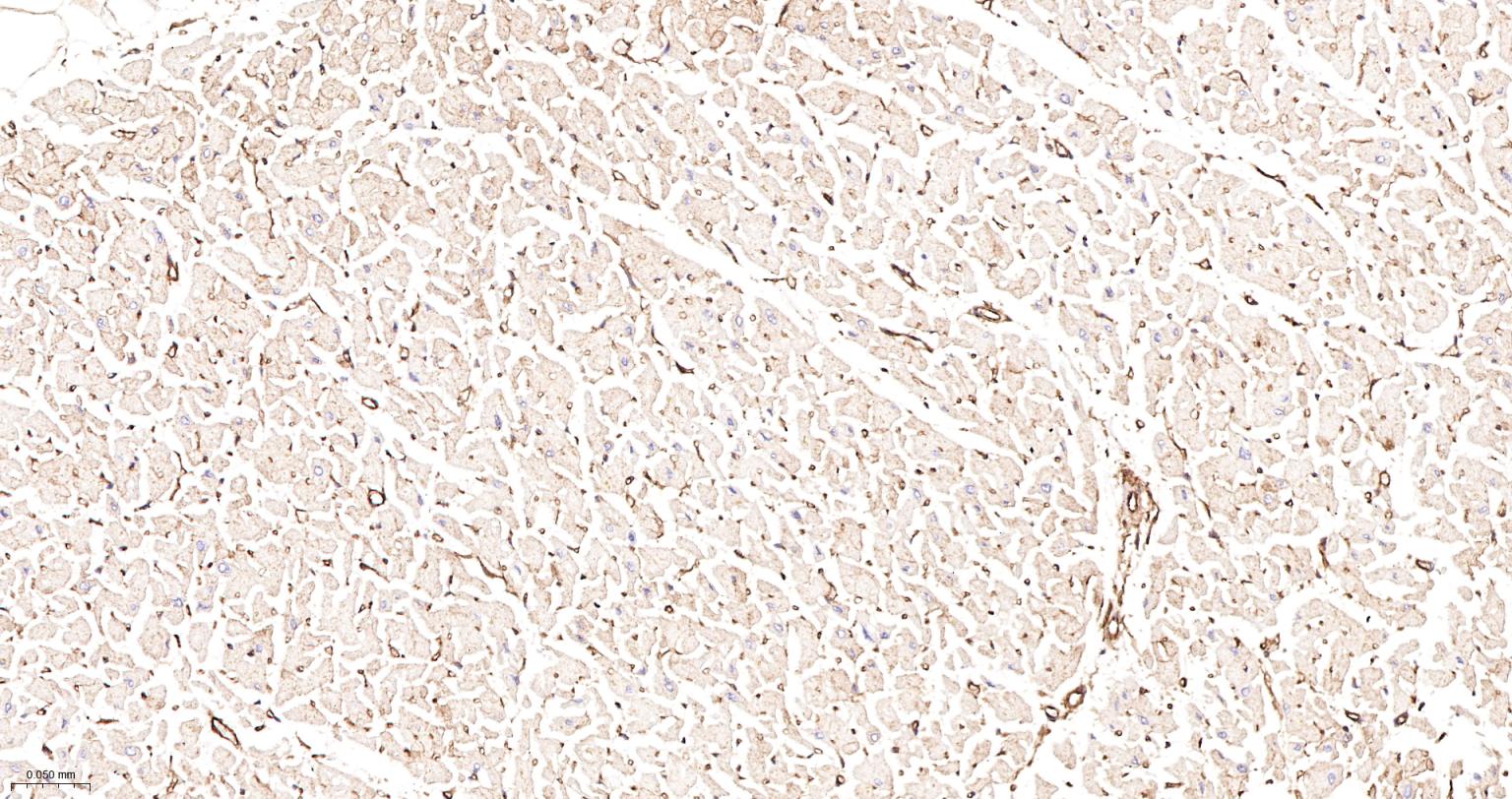 Paraformaldehyde-fixed, paraffin embedded Human Heart; Antigen retrieval by boiling in sodium citrate buffer (pH6.0) for 15 min; The section was incubated with Vinculin Monoclonal Antibody, Unconjugated (bsm-54148R) at 1:1000 overnight at 4°C, followed by conjugation to the bs-0295G-HRP and DAB (C-0010) staining.