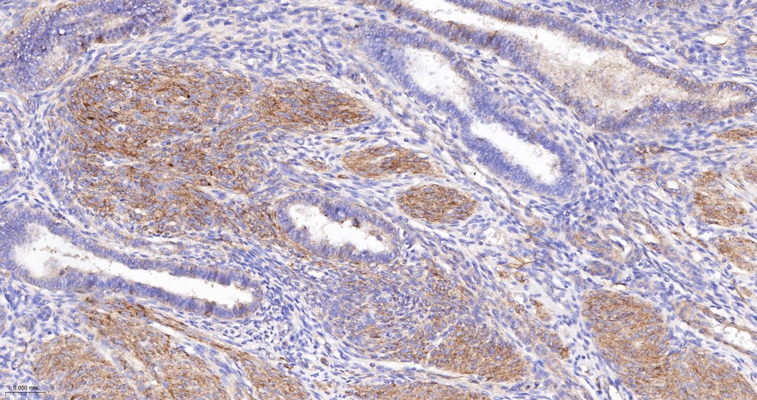 Paraformaldehyde-fixed, paraffin embedded Human Endometrium; Antigen retrieval by boiling in sodium citrate buffer (pH6.0) for 15 min; Antibody incubation with Vinculin Monoclonal Antibody, Unconjugated(bsm-54148R) at 1:500 overnight at 4°C, followed by conjugation to the bs-0295G-HRP and DAB (C-0010) staining.