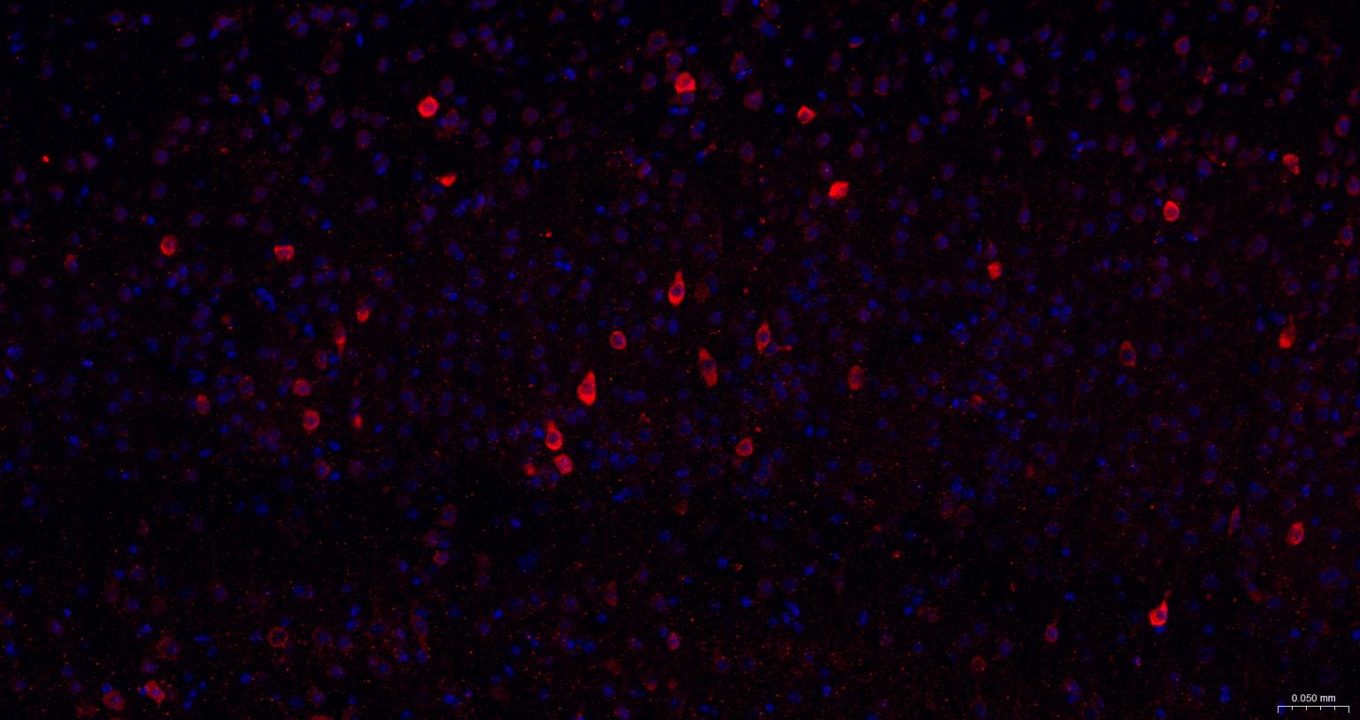 Paraformaldehyde-fixed, paraffin embedded Rat Cerebrum; Antigen retrieval by boiling in sodium citrate buffer (pH6.0) for 15 min; The section was incubated with NGF Monoclonal Antibody, Unconjugated (bsm-52362R) at 1:200 overnight at 4°C. Followed by conjugated Goat Anti-Rabbit IgG antibody (Red, bs-0295G-BF594), DAPI (blue, C02-04002) was used to stain the cell nuclei.