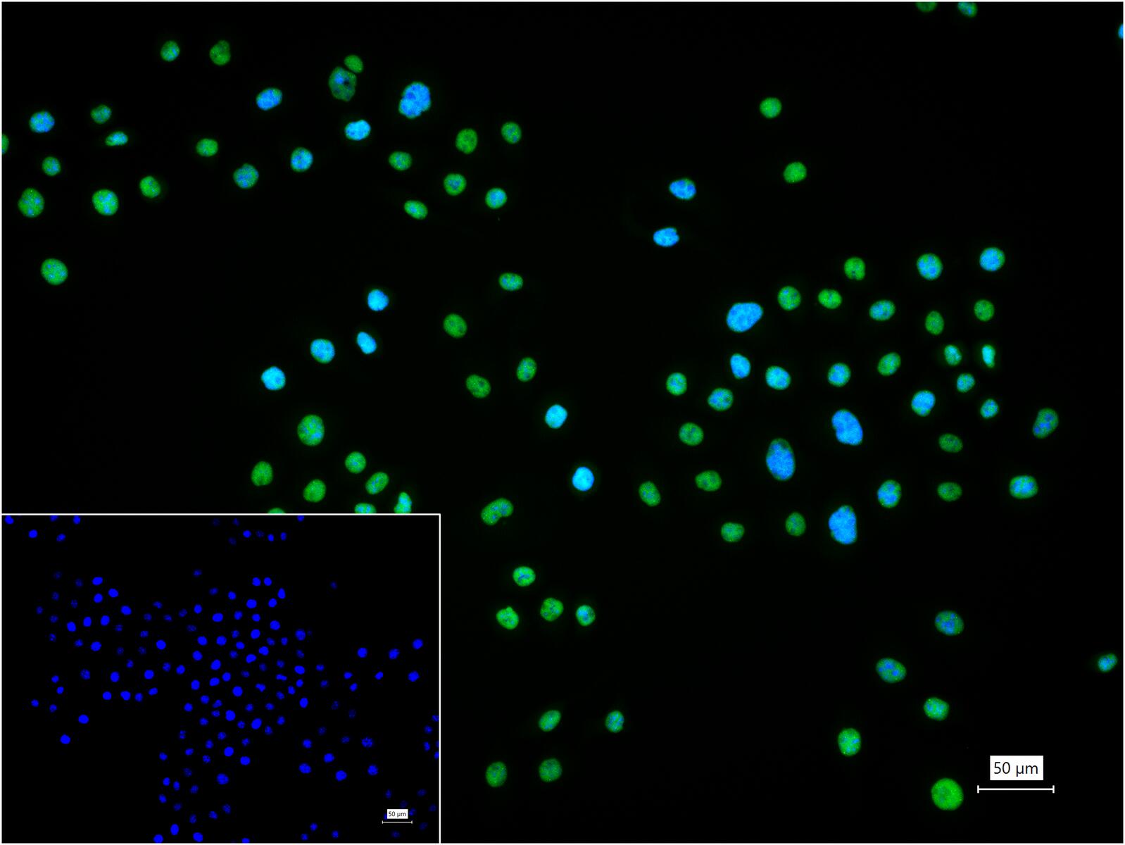 4% Paraformaldehyde-fixed HeLa (H) cell; Triton X-100 at r.t. for 20 min; Antibody incubation with (Bub3) monoclonal Antibody, unconjugated (bsm-54413R) 1:100, 90 min at 37°C; followed by BF488 conjugated Goat Anti-Rabbit IgG antibody (green, bs-60295G-BF488) at 37°C for 90 min, DAPI (blue, C02-04002) was used to stain the cell nuclei. PBS instead of the primary antibody was used as the blank control.