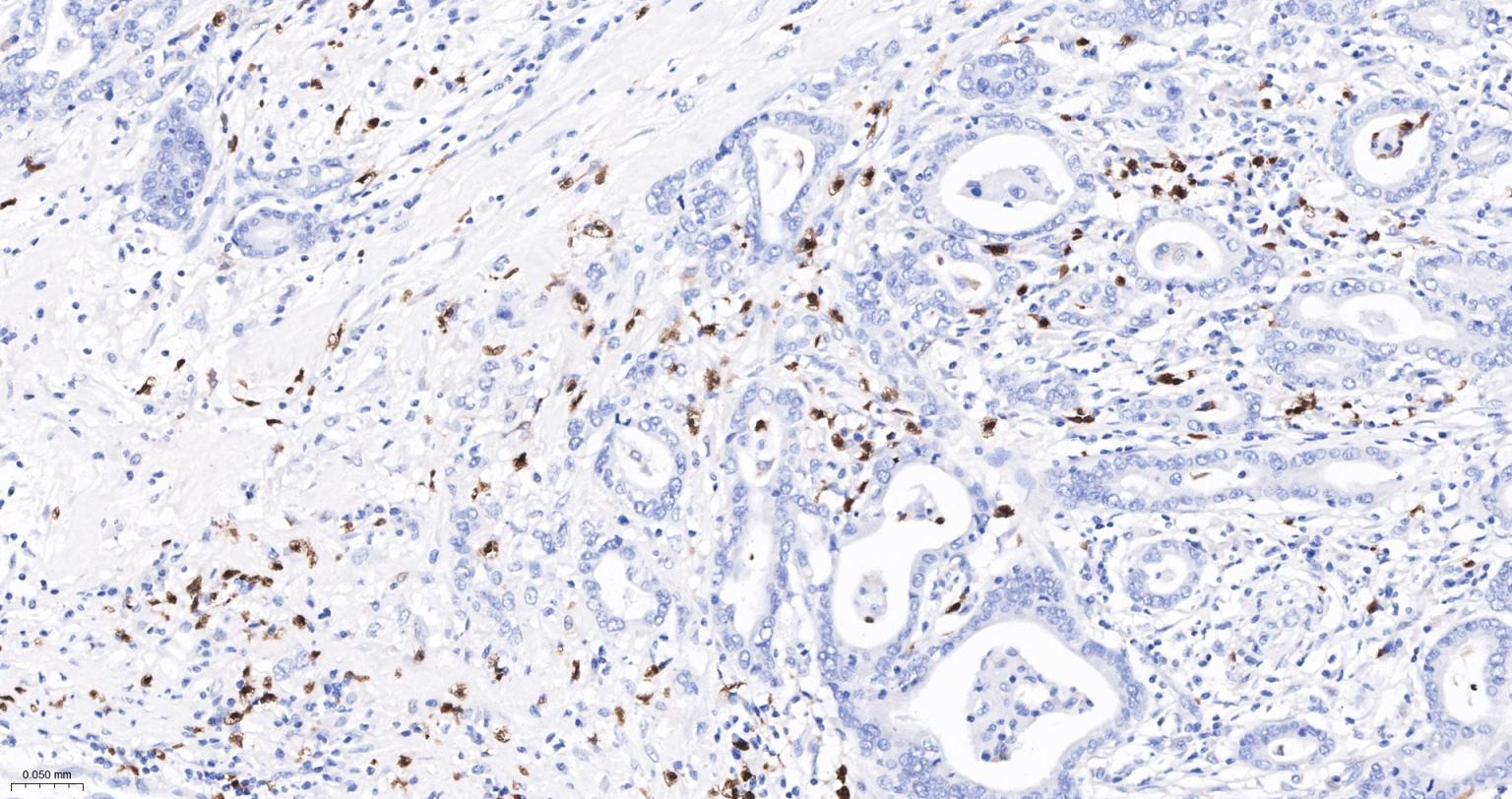 Paraformaldehyde-fixed, paraffin embedded Human Pancreatic Cancer; Antigen retrieval by boiling in sodium citrate buffer (pH6.0) for 15 min; The section was incubated with S100-A8/A9 Monoclonal Antibody, Unconjugated (bsm-41227M) at 1:200 overnight at 4°C, followed by conjugation to the bs-40296G-HRP and DAB (C-0010) staining.
