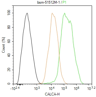 The TT (treated with BFA ) (H) cells were fixed with 4% PFA (10 min at r.t.) and then permeabilized with 90% ice-cold methanol for 20 min at -20℃,the cells then were incubated in 5%BSA to block non-specific protein-protein interactions (30 min at r.t.), followed by secondary antibody incubation for 40 min at room temperature. Primary Antibody (green):Mouse Anti-CALCA antibody (bsm-51512M,1:100); Isotype Control (orange): Mouse IgG (bs-0296P). Blank control (black): PBS. Acquisition of 20,000 events was performed.