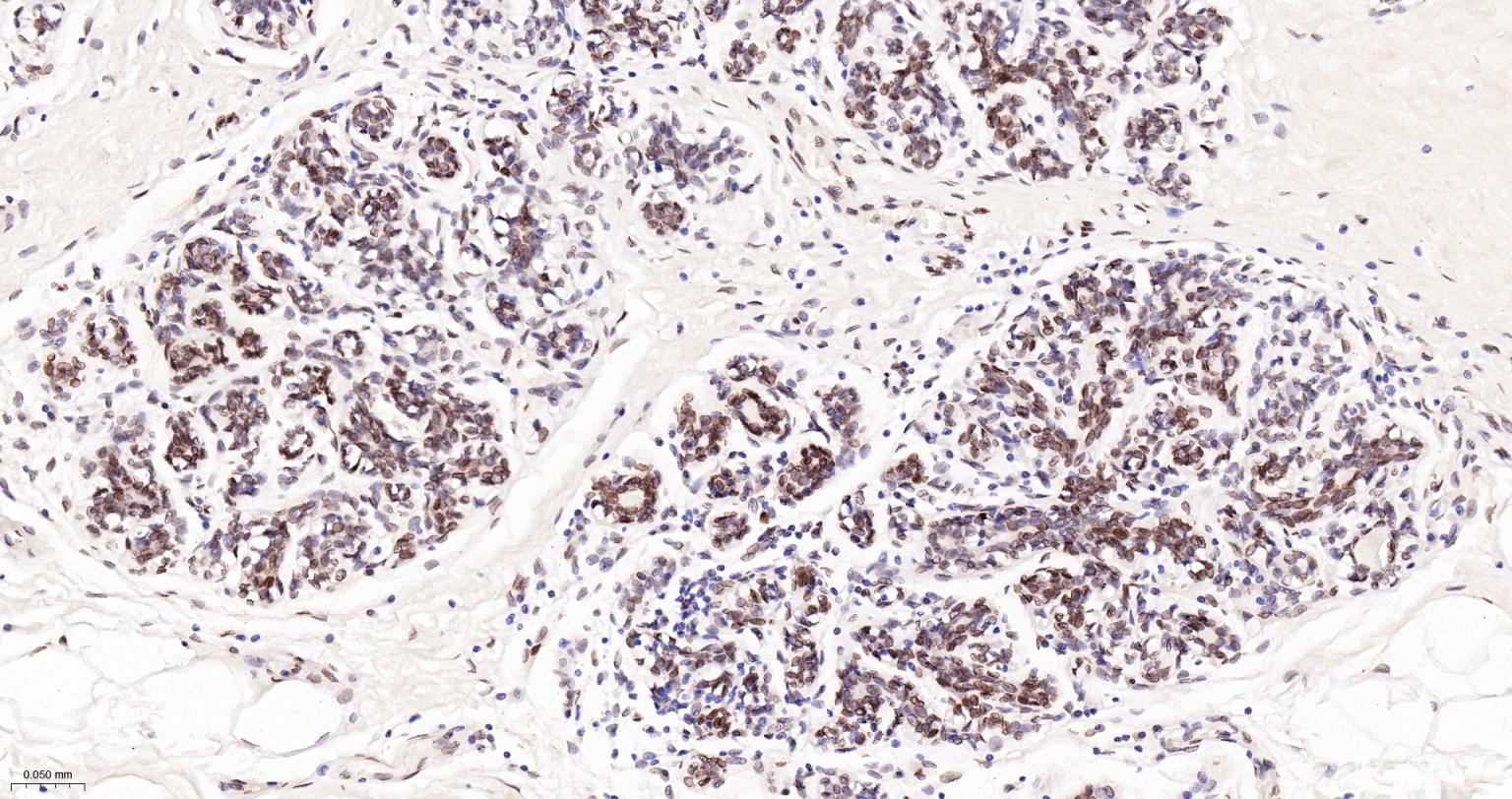 Paraformaldehyde-fixed, paraffin embedded Human Breast; Antigen retrieval by boiling in sodium citrate buffer (pH6.0) for 15 min; The section was incubated with Lamin A/C Monoclonal Antibody, Unconjugated (bsm-51683M) at 1:100 overnight at 4°C, followed by conjugation to the bs-40296G-HRP and DAB (C-0010) staining.