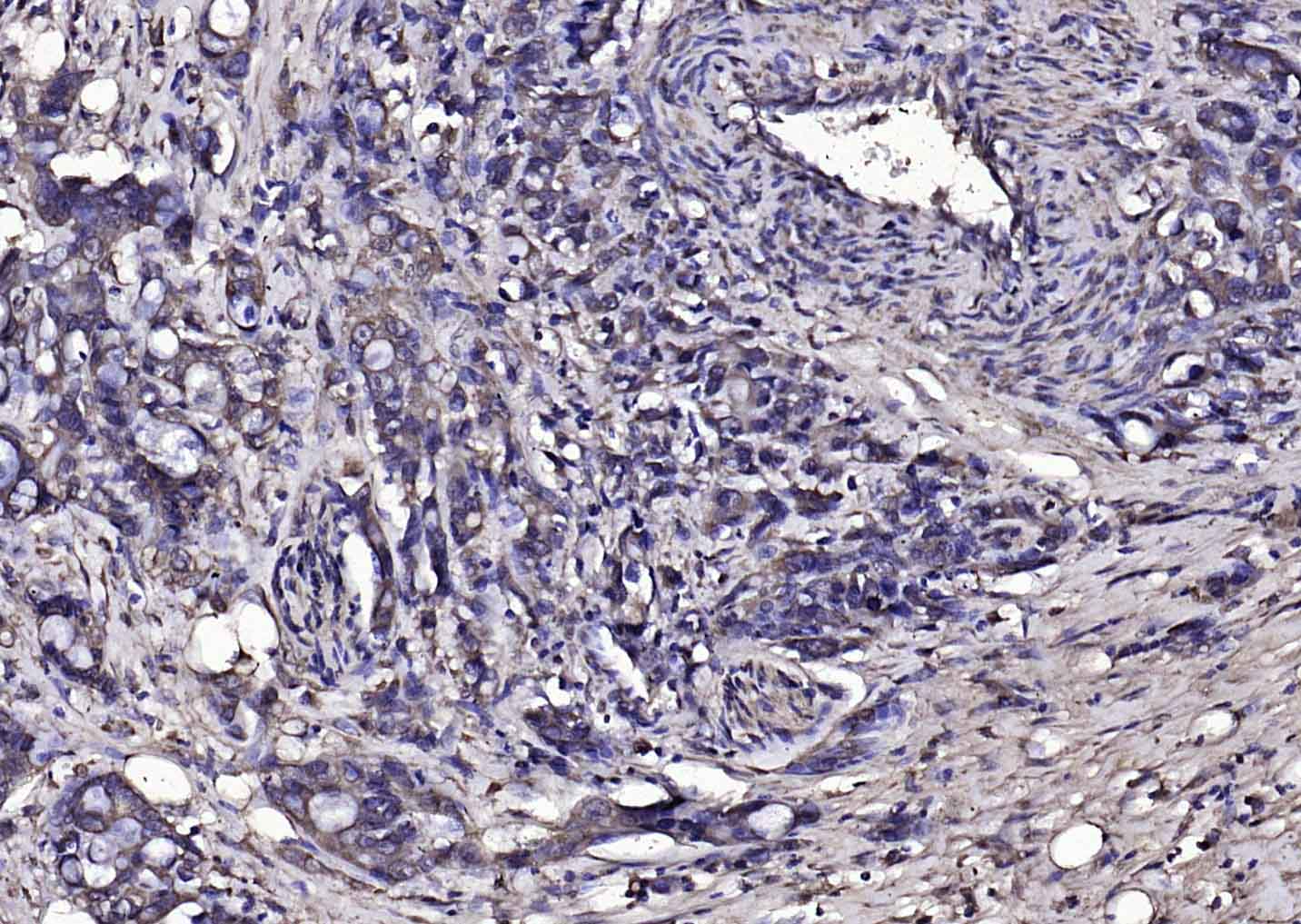 Paraformaldehyde-fixed, paraffin embedded (human rectal carcinoma); Antigen retrieval by boiling in sodium citrate buffer (pH6.0) for 15min; Block endogenous peroxidase by 3% hydrogen peroxide for 20 minutes; Blocking buffer (normal goat serum) at 37°C for 30min; Antibody incubation with (PI 3 Kinase p85 alpha) Polyclonal Antibody, Unconjugated (bs-24815R) at 1:200 overnight at 4°C, followed by operating according to SP Kit(Rabbit) (sp-0023) instructionsand DAB staining.