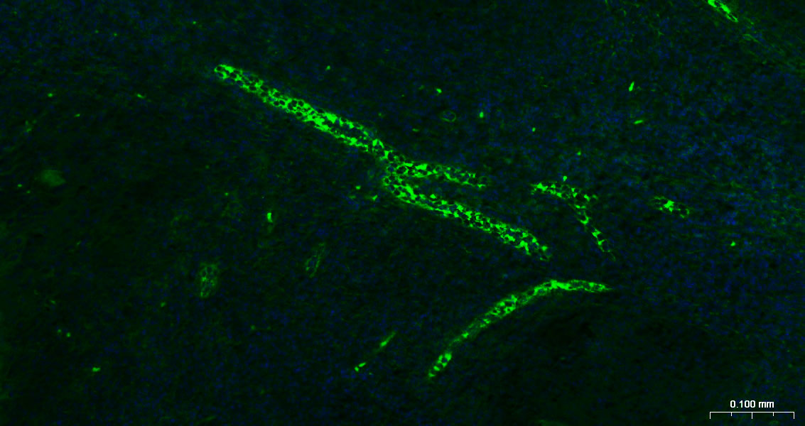Paraformaldehyde-fixed, paraffin embedded Human Tonsil; Antigen retrieval by boiling in sodium citrate buffer (pH6.0) for 15 min; The section was incubated with CD62p Monoclonal Antibody, Unconjugated (bsm-60008R) at 1:200 overnight at 4°C. Followed by conjugated Goat Anti-Rabbit IgG antibody (green, bs-0295G-BF488), DAPI (blue, C02-04002) was used to stain the cell nuclei.