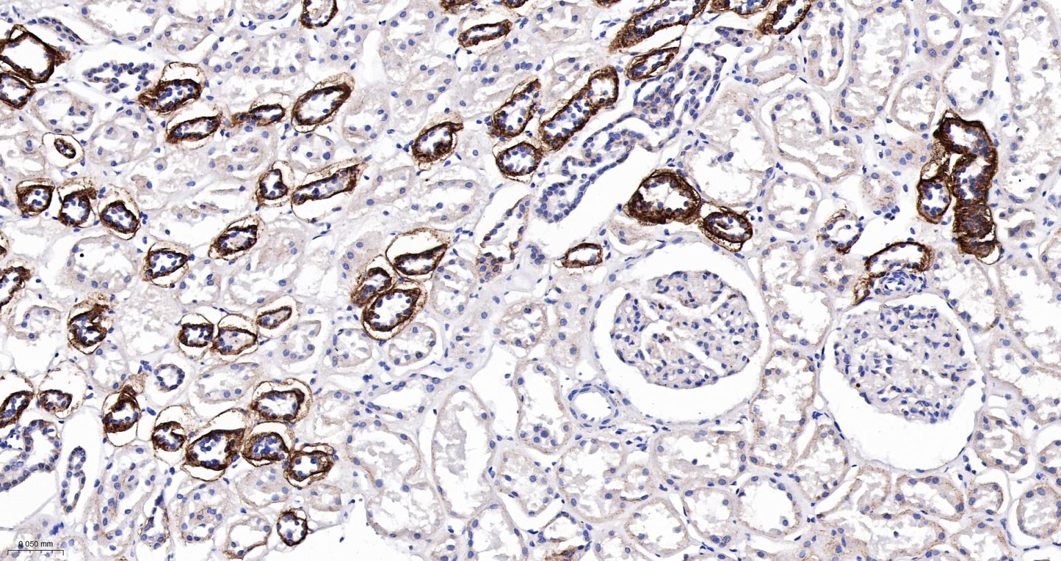 Paraformaldehyde-fixed, paraffin embedded Human Kidney; Antigen retrieval by boiling in sodium citrate buffer (pH6.0) for 15 min; The section was incubated with Alpha Synuclein Monoclonal Antibody, Unconjugated (bsm-54277R) at 1:200 overnight at 4°C, followed by conjugation to the bs-0295G-HRP and DAB (C-0010) staining.