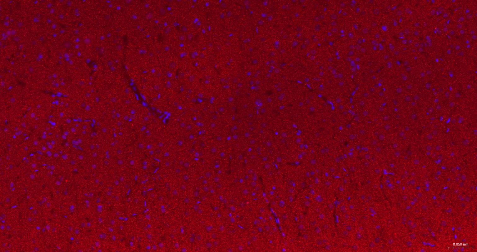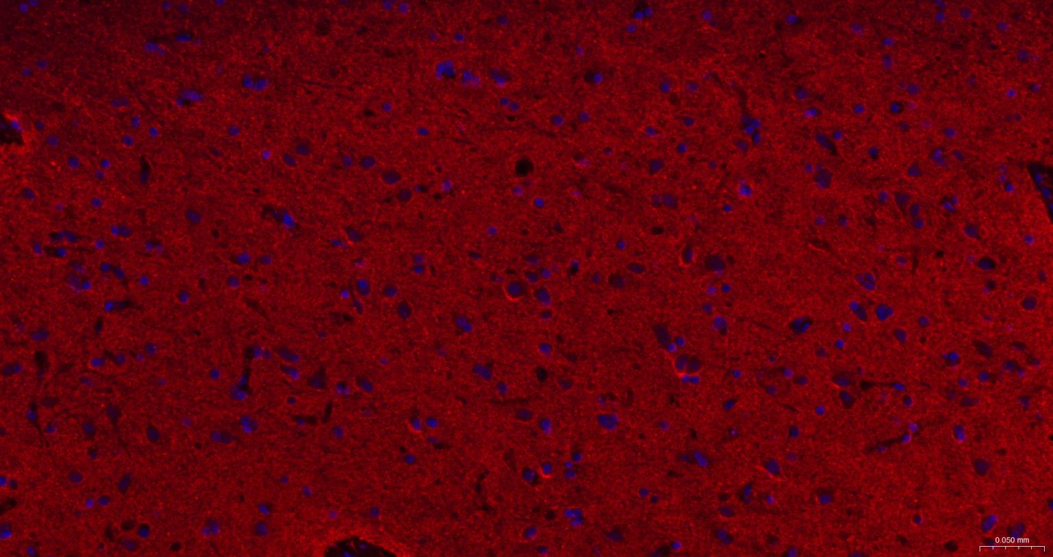 Paraformaldehyde-fixed, paraffin embedded Rat Cerebrum; Antigen retrieval by boiling in sodium citrate buffer (pH6.0) for 15 min; The section was incubated with Alpha Synuclein Monoclonal Antibody, Unconjugated (bsm-54277R) at 1:200 overnight at 4°C. Followed by conjugated Goat Anti-Rabbit IgG antibody (Red, bs-0295G-BF594), DAPI (blue, C02-04002) was used to stain the cell nuclei.