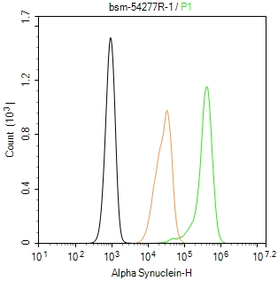 The SK-MEL-28 (H) cells were fixed with 4% PFA (10 min at r.t.) and then permeabilized with 90% ice-cold methanol for 20 min at -20℃,the cells then were incubated in 5%BSA to block non-specific protein-protein interactions (30 min at r.t.), followed by secondary antibody incubation for 40 min at room temperature. Primary Antibody (green):Rabbit Anti-Alpha Synuclein antibody (bsm-54277R,1:100); Isotype Control (orange): Rabbit IgG (bs-0295P). Blank control (black): PBS. Acquisition of 20,000 events was performed.