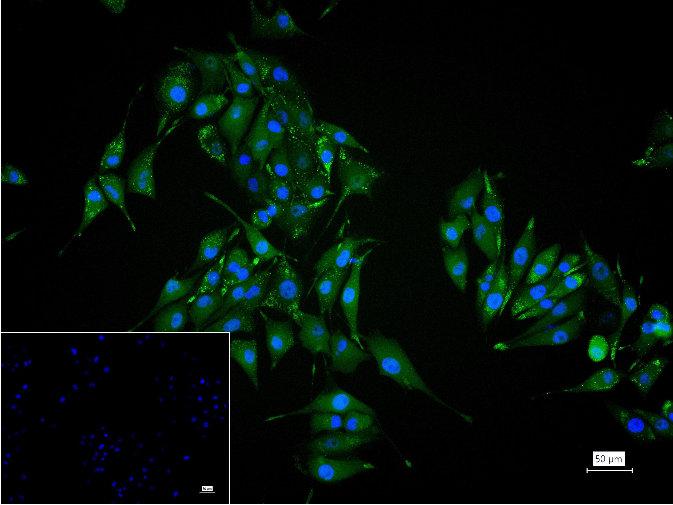4% Paraformaldehyde-fixed SK-MEL-28 (H) cell; Triton X-100 at r.t. for 20 min; Antibody incubation with (Alpha Synuclein) monoclonal Antibody, unconjugated (bsm-54277R) 1:100, 90 min at 37°C; followed by BF488 conjugated Goat Anti-Rabbit IgG antibody (green, bs-60295G-BF488) at 37°C for 90 min, DAPI (blue, C02-04002) was used to stain the cell nuclei. PBS instead of the primary antibody was used as the blank control.