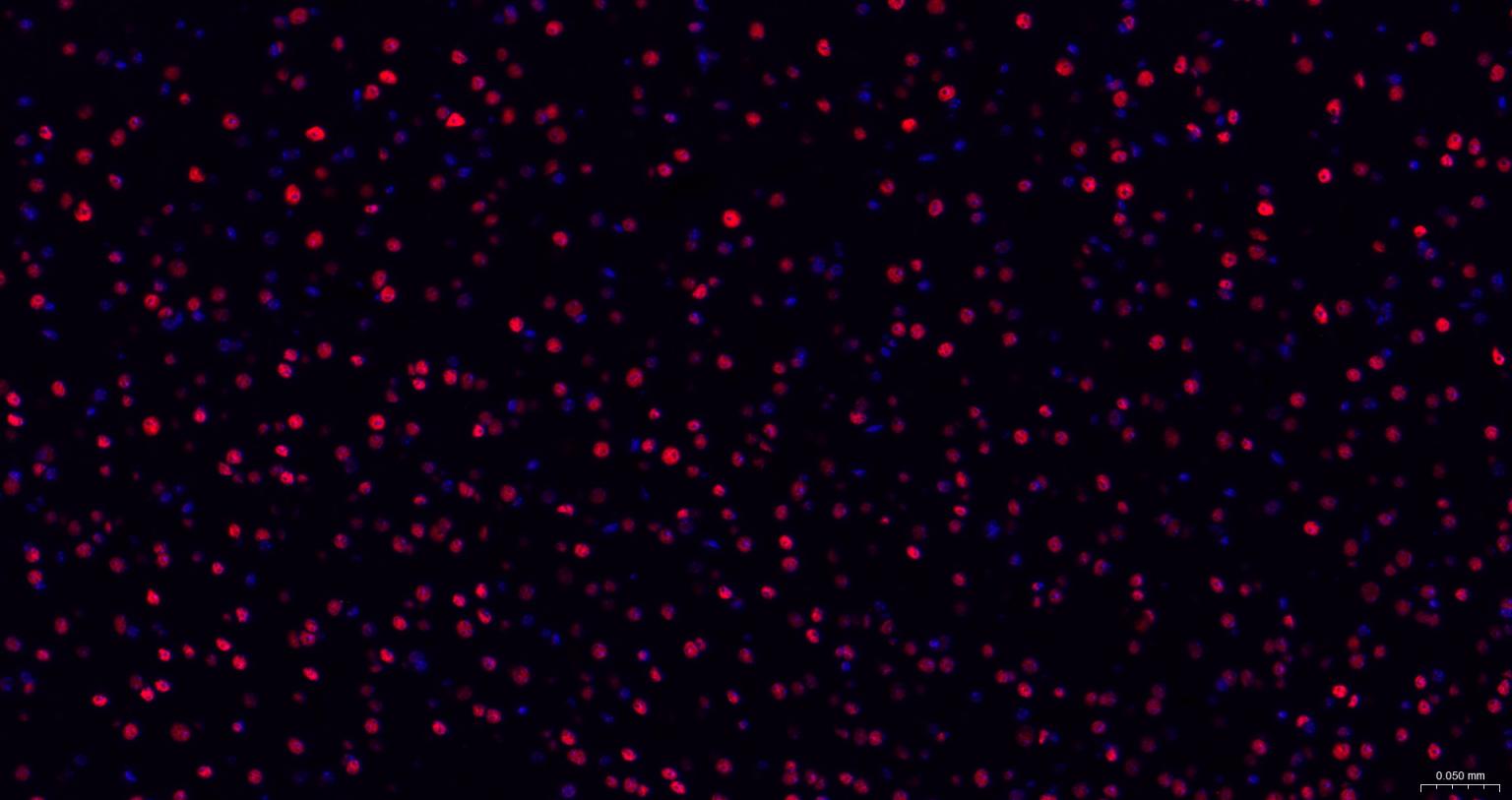 Paraformaldehyde-fixed, paraffin embedded Rat Cerebrum; Antigen retrieval by boiling in sodium citrate buffer (pH6.0) for 15 min; The section was incubated with TARDBP Monoclonal Antibody, Unconjugated (bsm-52949R) at 1:200 overnight at 4°C. Followed by conjugated Goat Anti-Rabbit IgG antibody (Red, bs-0295G-BF594), DAPI (blue, C02-04002) was used to stain the cell nuclei.