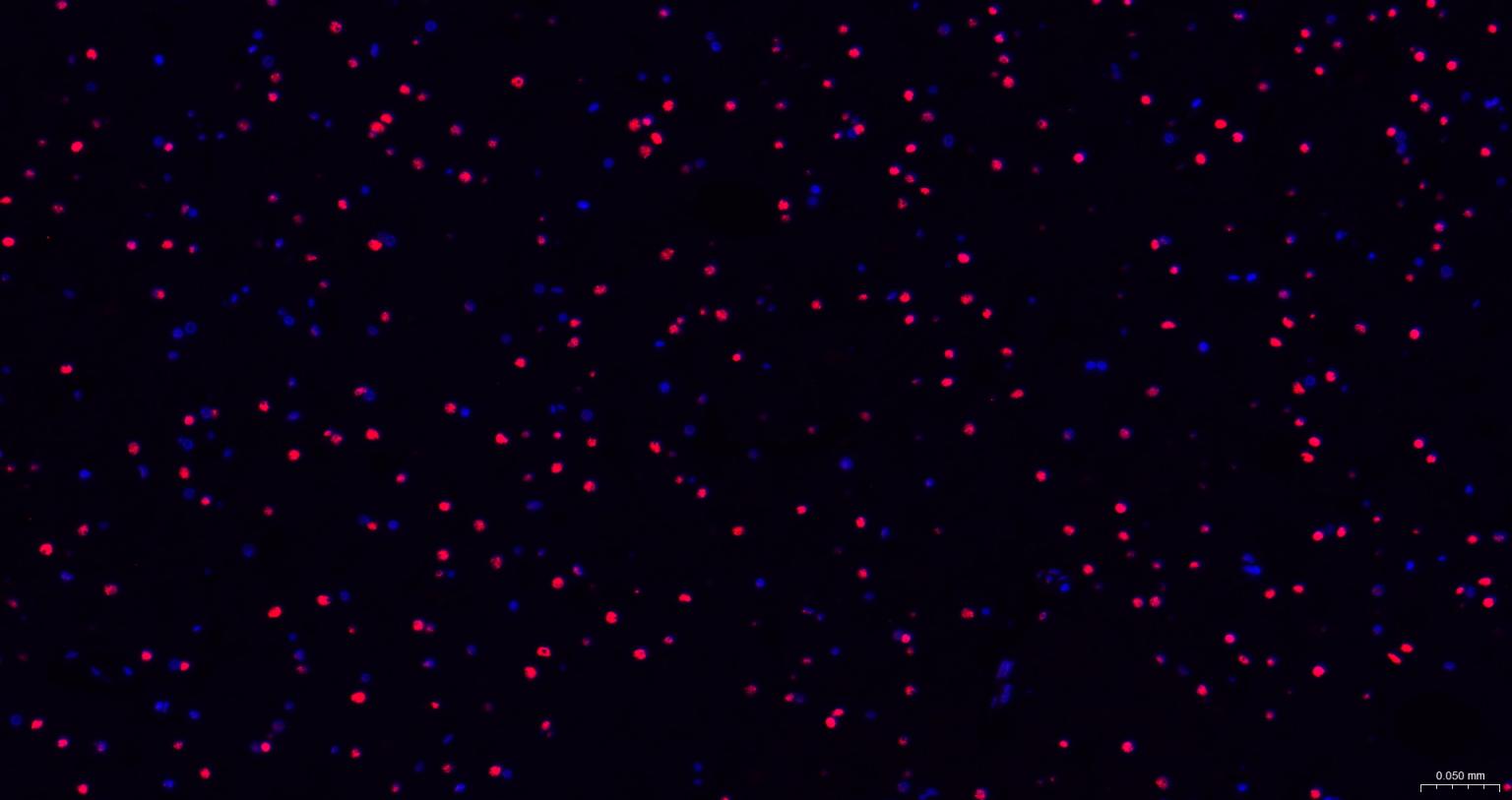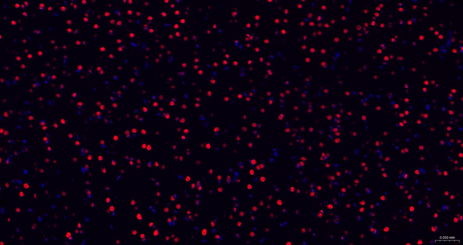 Paraformaldehyde-fixed, paraffin embedded Human Cerebrum; Antigen retrieval by boiling in sodium citrate buffer (pH6.0) for 15 min; The section was incubated with TARDBP Monoclonal Antibody, Unconjugated (bsm-52949R) at 1:200 overnight at 4°C. Followed by conjugated Goat Anti-Rabbit IgG antibody (Red, bs-0295G-BF594), DAPI (blue, C02-04002) was used to stain the cell nuclei.
