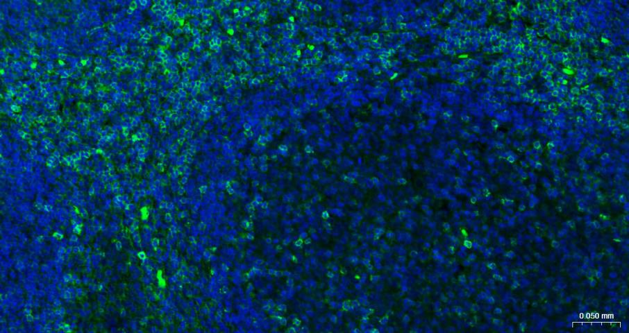 Paraformaldehyde-fixed, paraffin embedded Human Tonsil; Antigen retrieval by boiling in sodium citrate buffer (pH6.0) for 15 min; The section was incubated with CD7 Monoclonal Antibody, Unconjugated (bsm-60231R) at 1:200 overnight at 4°C. Followed by conjugated Goat Anti-Rabbit IgG antibody (green, bs-0295G-BF488), DAPI (blue, C02-04002) was used to stain the cell nuclei.