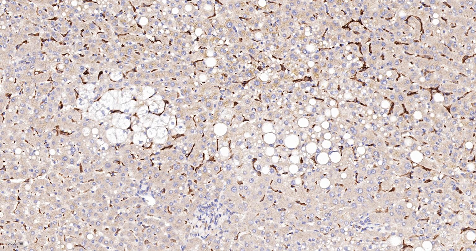 Paraformaldehyde-fixed, paraffin embedded Human Liver; Antigen retrieval by boiling in sodium citrate buffer (pH6.0) for 15 min; The section was incubated with SIGLEC1 Monoclonal Antibody, Unconjugated (bsm-60328R) at 1:300 overnight at 4°C, followed by conjugation to the bs-0295G-HRP and DAB (C-0010) staining.