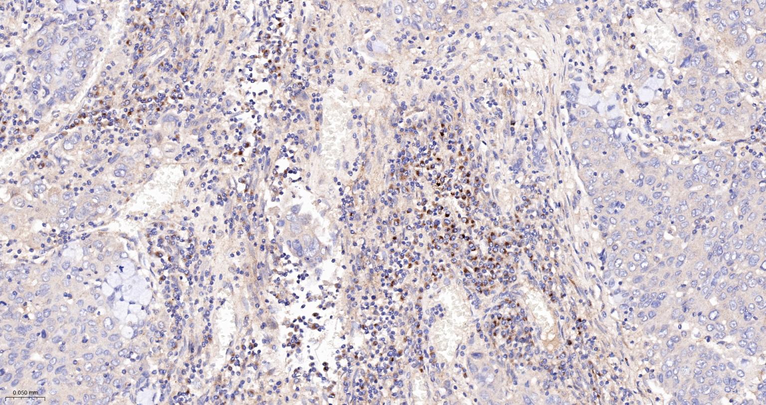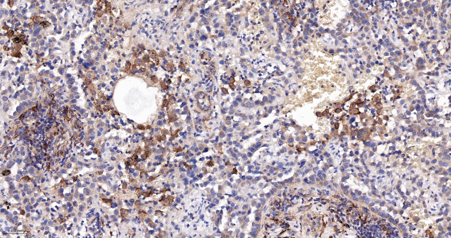 Paraformaldehyde-fixed, paraffin embedded Human Lung Cancer; Antigen retrieval by boiling in sodium citrate buffer (pH6.0) for 15 min; The section was incubated with SIGLEC1 Monoclonal Antibody, Unconjugated (bsm-60328R) at 1:300 overnight at 4°C, followed by conjugation to the bs-0295G-HRP and DAB (C-0010) staining.