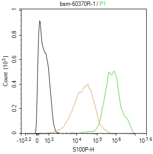The HT-29 (H) cells were fixed with 4% PFA (10 min at r.t.) and then permeabilized with 90% ice-cold methanol for 20 min at -20℃,the cells then were incubated in 5%BSA to block non-specific protein-protein interactions (30 min at r.t.), followed by secondary antibody incubation for 40 min at room temperature. Primary Antibody (green):Rabbit Anti-S100P antibody (bsm-60370R,1:100); Isotype Control (orange): Rabbit IgG (bs-0295P). Blank control (black): PBS. Acquisition of 20,000 events was performed.