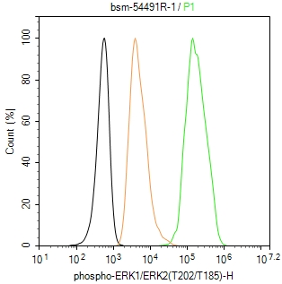 The HeLa (treated with 200 ng/ml TPA/PMA for 30 minutes) (H) cells were fixed with 4% PFA (10 min at r.t.) and then permeabilized with 90% ice-cold methanol for 20 min at -20℃,the cells then were incubated in 5%BSA to block non-specific protein-protein interactions (30 min at r.t.), followed by secondary antibody incubation for 40 min at room temperature. Primary Antibody (green):Rabbit Anti-phospho-ERK1/ERK2(T202/T185) antibody (bsm-54491R,1:100); Isotype Control (orange): Rabbit IgG (bs-0295P). Blank control (black): PBS. Acquisition of 20,000 events was performed.