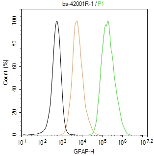 The U-251 MG (H) cells were fixed with 4% PFA (10 min at r.t.) and then permeabilized with 90% ice-cold methanol for 20 min at -20℃,the cells then were incubated in 5%BSA to block non-specific protein-protein interactions (30 min at r.t.), followed by secondary antibody incubation for 40 min at room temperature. Primary Antibody (green):Rabbit Anti-GFAP antibody (bs-42001R,1:100); Isotype Control (orange): Rabbit IgG (bs-0295P). Blank control (black): PBS. Acquisition of 20,000 events was performed.