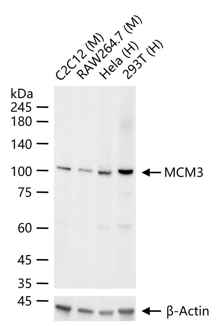 25 ug total protein per lane of various lysates (see on figure) probed with MCM3 monoclonal antibody, unconjugated (bsm-60606R) at 1:1000 dilution and 4°C overnight incubation. Followed by conjugated secondary antibody incubation at r.t. for 60 min.