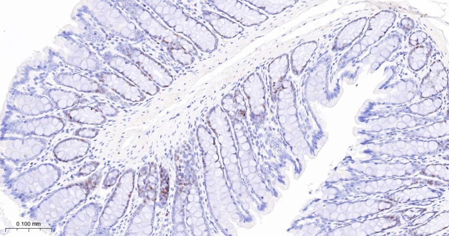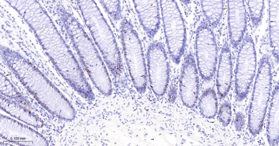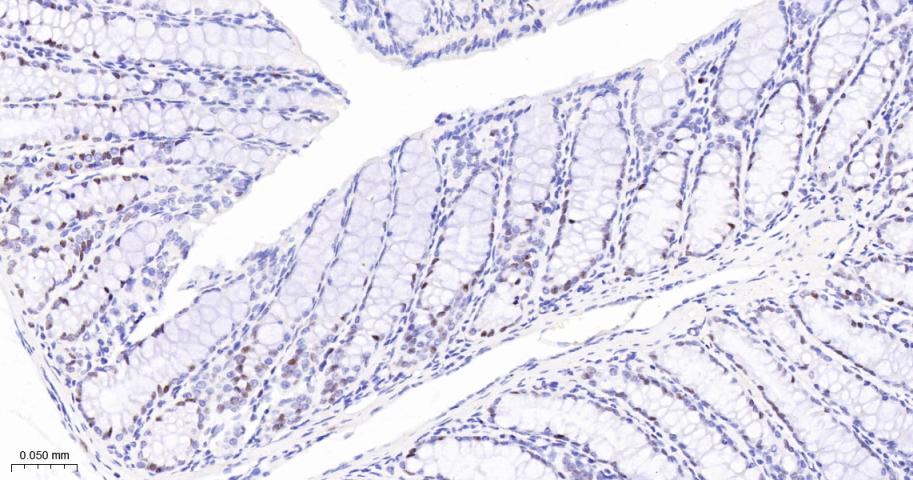 Paraformaldehyde-fixed, paraffin embedded Mouse Colon; Antigen retrieval by boiling in sodium citrate buffer (pH6.0) for 15 min; The section was incubated with MCM3 Monoclonal Antibody, Unconjugated (bsm-60606R) at 1:200 overnight at 4°C, followed by conjugation to the bs-0295G-HRP and DAB (C-0010) staining.