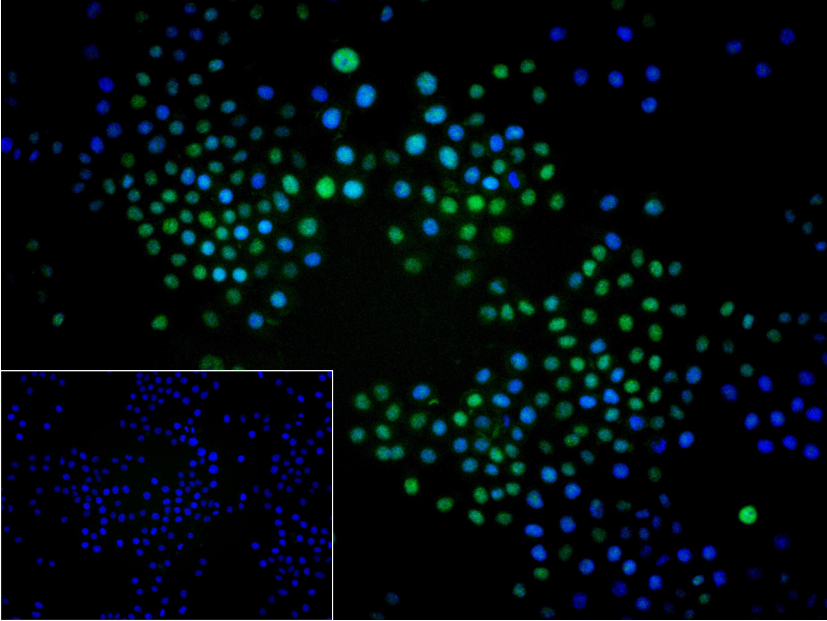 4% Paraformaldehyde-fixed Hela (H) cell; Triton X-100 at r.t. for 20 min; Antibody incubation with (MCM3) monoclonal Antibody, unconjugated (bsm-60606R) 1:100, 90 min at 37°C; followed by conjugated Goat Anti-Rabbit IgG antibody (green, bs-60295G-BF488) at 37°C for 90 min, DAPI (blue, C02-04002) was used to stain the cell nuclei. PBS instead of the primary antibody was used as the blank control.
