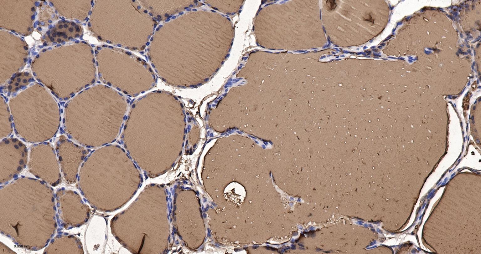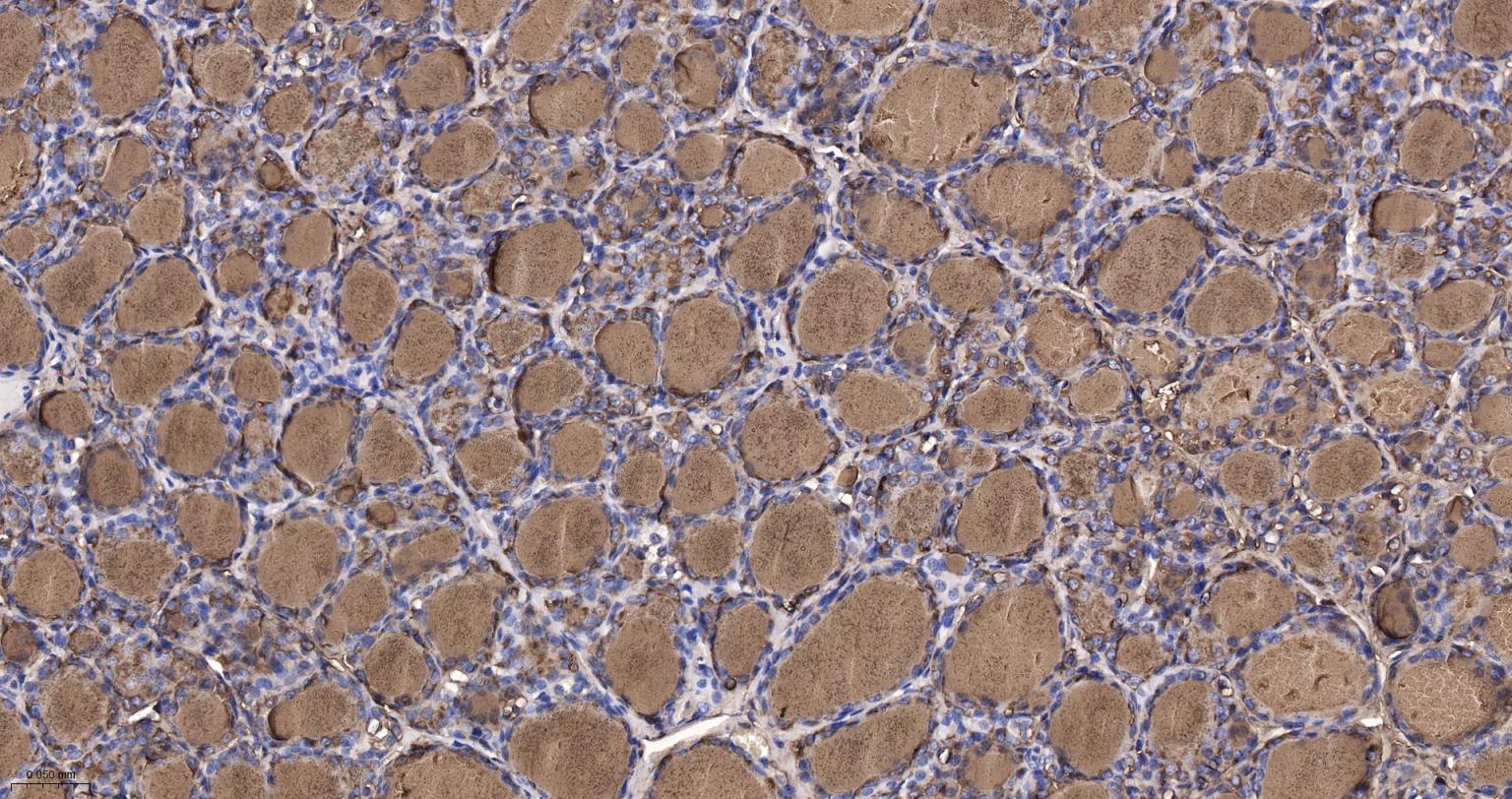 Paraformaldehyde-fixed, paraffin embedded Mouse Thyroid Gland; Antigen retrieval by boiling in sodium citrate buffer (pH6.0) for 15 min; Antibody incubation with TG Monoclonal Antibody, Unconjugated(bsm-60597R) at 1:200 overnight at 4°C, followed by conjugation to the bs-0295G-HRP and DAB (C-0010) staining.