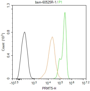 The Hela (H) cells were fixed with 4% PFA (10 min at r.t.) and then permeabilized with 90% ice-cold methanol for 20 min at -20℃,the cells then were incubated in 5%BSA to block non-specific protein-protein interactions (30 min at r.t.),followed by secondary antibody incubation for 40 min at room temperature. Primary Antibody (green):Rabbit Anti-PRMT5 antibody (bsm-60525R,1:100); Isotype Control (orange): Rabbit IgG (bs-0295P). Blank control (black): PBS. Acquisition of 20,000 events was performed.