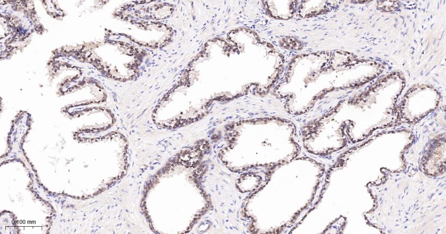 Paraformaldehyde-fixed, paraffin embedded Human Prostate Cancer; Antigen retrieval by boiling in sodium citrate buffer (pH6.0) for 15 min; The section was incubated with PRMT5 Monoclonal Antibody, Unconjugated (bsm-60525R) at 1:200 overnight at 4°C, followed by conjugation to the bs-0295G-HRP and DAB (C-0010) staining.