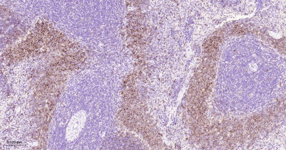 Paraformaldehyde-fixed, paraffin embedded Rat Spleen; Antigen retrieval by boiling in sodium citrate buffer (pH6.0) for 15 min; Antibody incubation with LY75 Monoclonal Antibody, Unconjugated(bsm-60593R) at 1:200 overnight at 4°C, followed by conjugation to the bs-0295G-HRP and DAB (C-0010) staining.