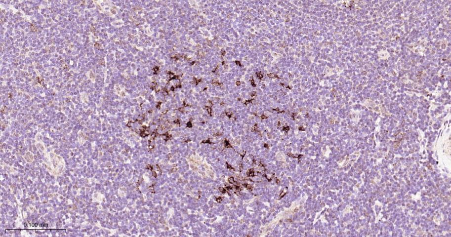 Paraformaldehyde-fixed, paraffin embedded Mouse Spleen; Antigen retrieval by boiling in sodium citrate buffer (pH6.0) for 15 min; Antibody incubation with LY75 Monoclonal Antibody, Unconjugated(bsm-60593R) at 1:200 overnight at 4°C, followed by conjugation to the bs-0295G-HRP and DAB (C-0010) staining.