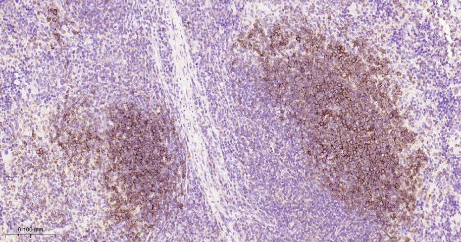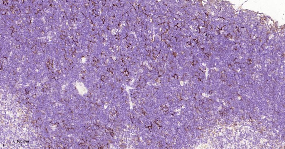 Paraformaldehyde-fixed, paraffin embedded Human Tonsil; Antigen retrieval by boiling in sodium citrate buffer (pH6.0) for 15 min; Antibody incubation with LY75 Monoclonal Antibody, Unconjugated(bsm-60593R) at 1:200 overnight at 4°C, followed by conjugation to the bs-0295G-HRP and DAB (C-0010) staining.