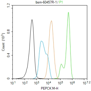 The SH-SY5Y (H) cells were fixed with 4% PFA (10 min at r.t.) and then permeabilized with 90% ice-cold methanol for 20 min at -20℃,the cells then were incubated in 5%BSA to block non-specific protein-protein interactions (30 min at r.t.).Primary Antibody (green):Rabbit Anti-PEPCK M antibody (bsm-60457R,1:100); Secondary Antibody (white blue): Goat anti-Rabbit IgG-BF488 (bs-60295G-BF488): 1 μg/test. Isotype Control (orange): Rabbit IgG (bs-0295P). Blank control (black): PBS. Acquisition of 20,000 events was performed.