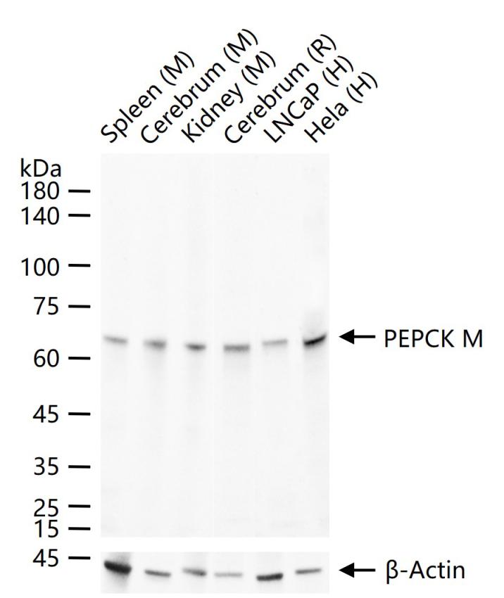 25 ug total protein per lane of various lysates (see on figure) probed with PEPCK M monoclonal antibody, unconjugated (bsm-60457R) at 1:1000 dilution and 4°C overnight incubation. Followed by conjugated secondary antibody incubation at r.t. for 60 min.