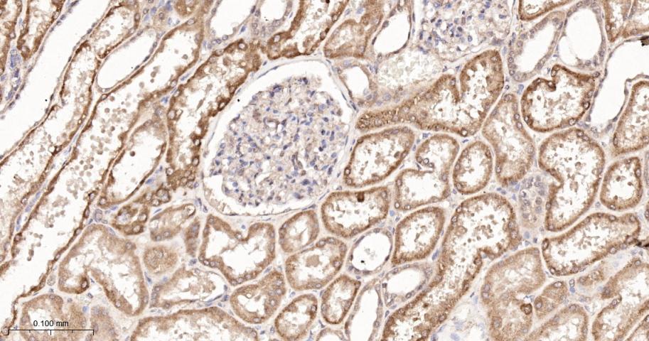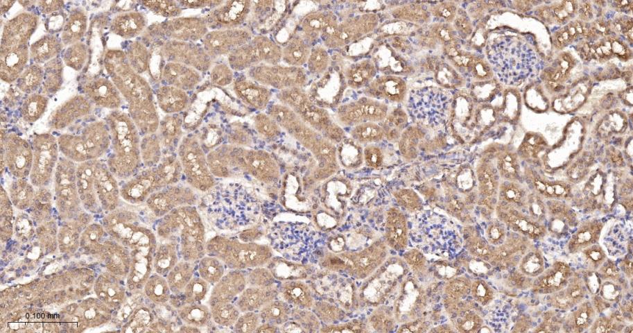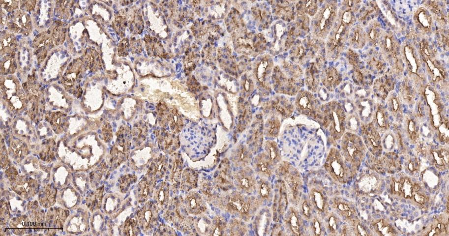Paraformaldehyde-fixed, paraffin embedded Rat Kideny; Antigen retrieval by boiling in sodium citrate buffer (pH6.0) for 15 min; The section was incubated with PCK2 Monoclonal Antibody, Unconjugated (bsm-60457R) at 1:200 overnight at 4°C, followed by conjugation to the bs-0295G-HRP and DAB (C-0010) staining.